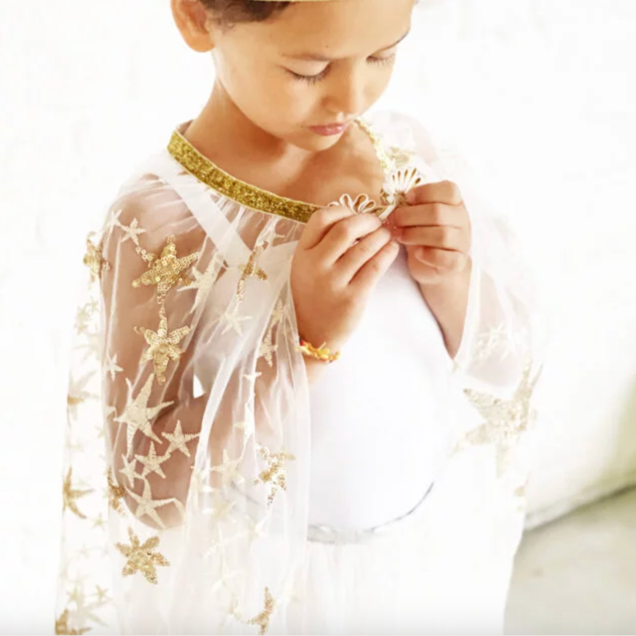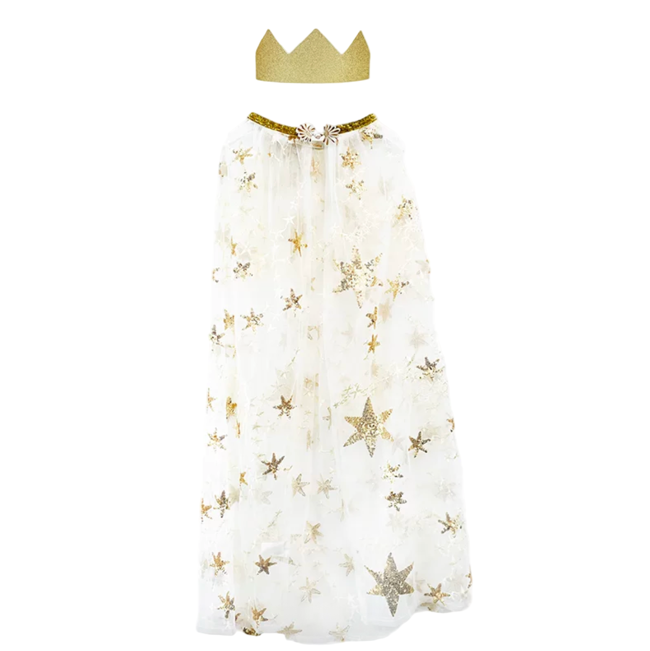 • Long gold sequined cape with matching crown