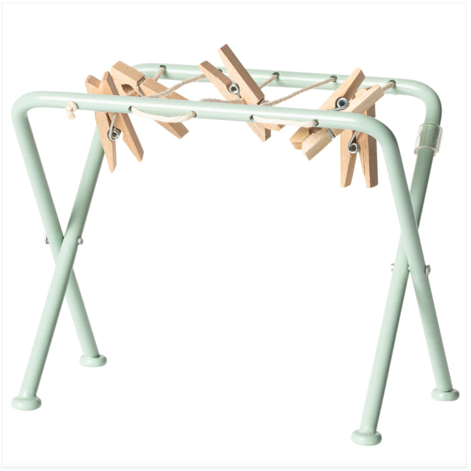 - Maileg Doll House Clothes Rack has a metal frame and comes with 6 wooden pegs.