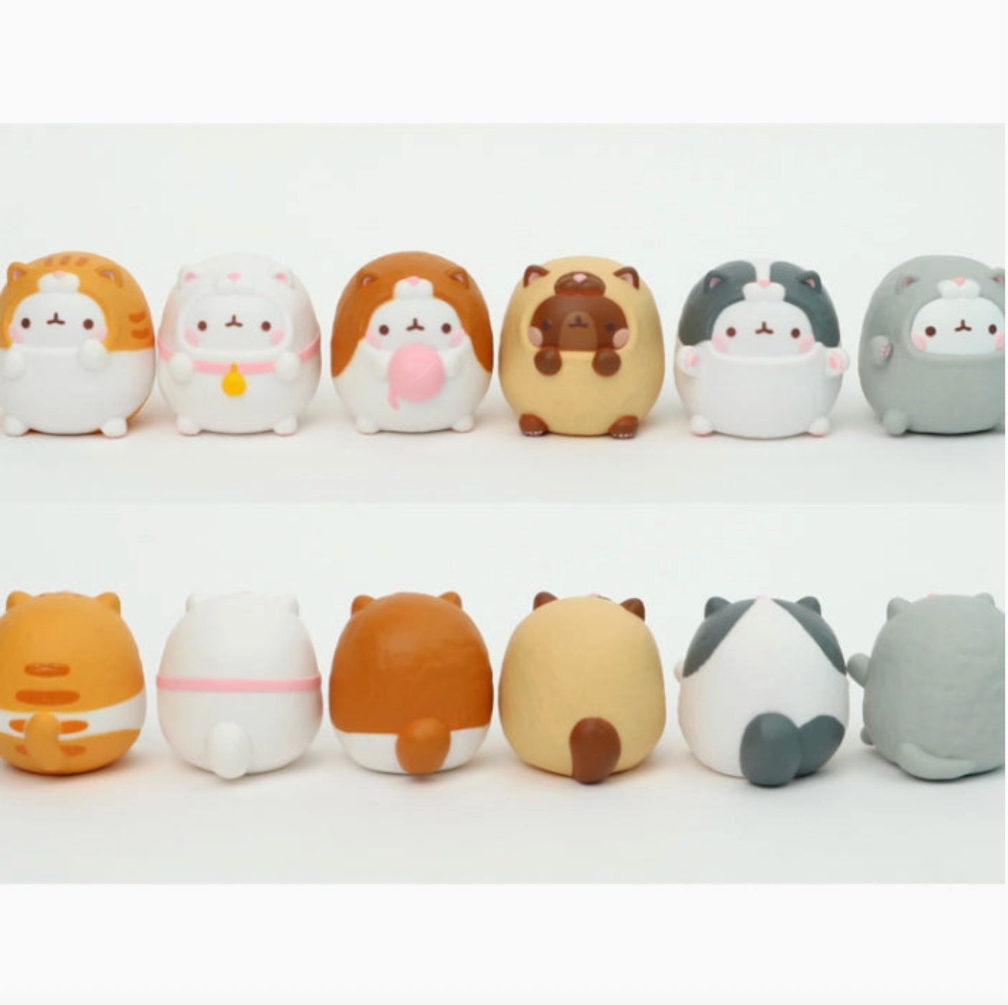 - Each figure in this adorable blind box collection features Molang dressed up as a different chubby kitty in delightfully detailed designs — from tabby stripes to gray fluff, complete with tiny tails and cute accessories like a yarn ball or bell